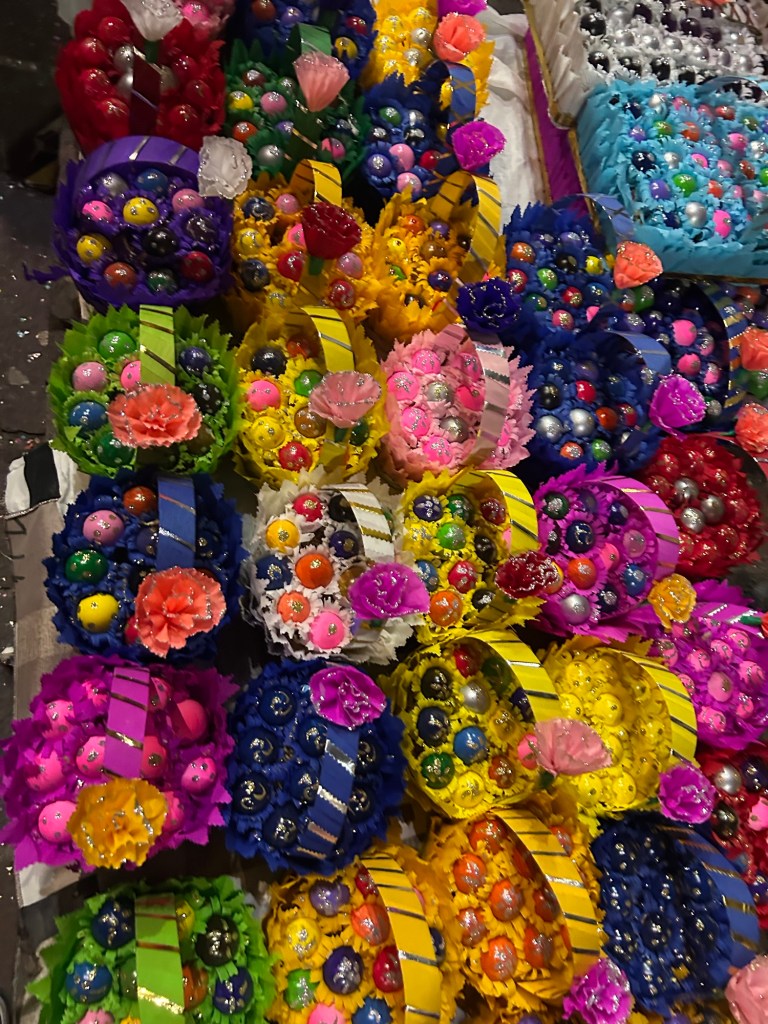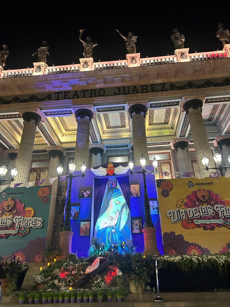 Bajamos caminando hacia el centro y ya se sentía la fiesta. Paramos en el Cafetal por gasolina, un latte deslactosado y descafeinado. Ya eran más de las siete. Seguimos por el Campanero hasta el Teatro Juárez, entre manos que iban y venían armando el altar para la Virgen de Dolores.